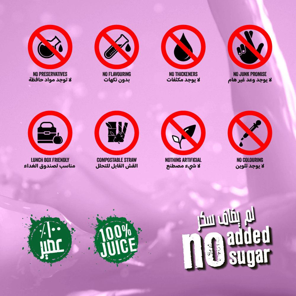 - خالٍ من أي سكر مضاف أو محليات صناعية، لتستمتع بالحلاوة الأصيلة للفواكه كما هي.